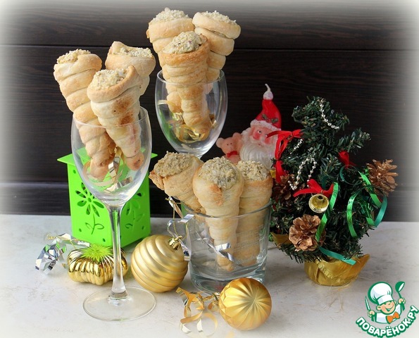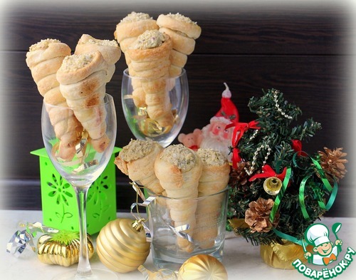 Слоеные конусы начинить готовым паштетом и подать к столу.