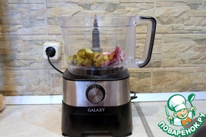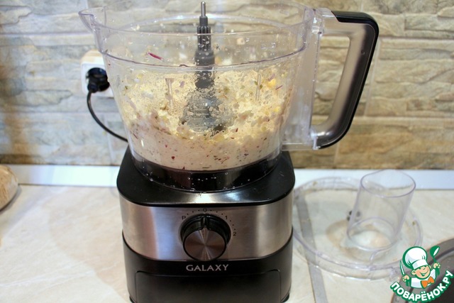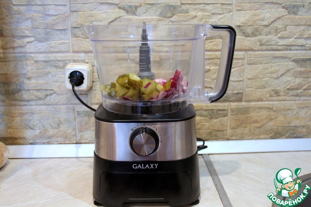 Лук с соленым огурцом измельчить в комбайне GALAXY GL2300 ножами для измельчения. Руками отжать лишний сок.