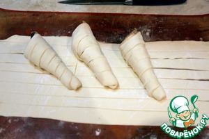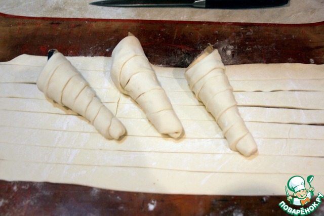 Тесто размороз ть, немного раскатать, нарезать на узкие полоски, накрутить на конусы ( у меня самодельные)