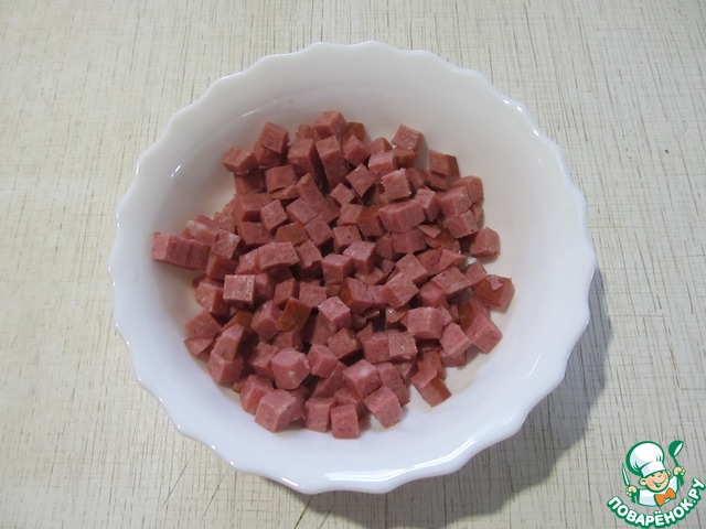 В салатник выложить лук, яйцо, кукурузу, колбасу, заправить майонезом.
