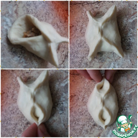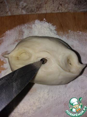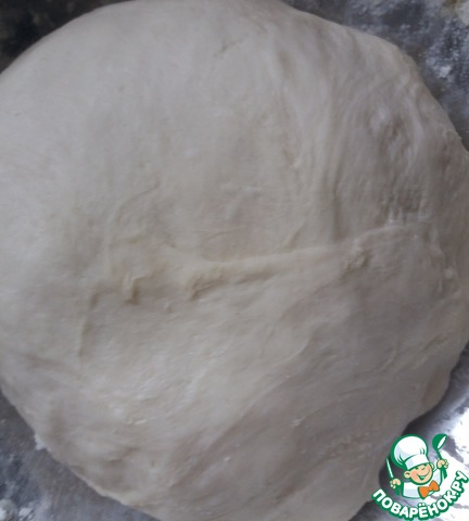 Начинаем ваять. Тесто на присыпанной мукой поверхности скатаем в колбаску и разделим на 24 части. Половину накроем, чтобы не заветрилось. Берём кусочек теста, раскатываем/разминаем руками, кладём столовую ложку начинки.