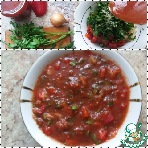Тем временем готовим соус. Мелко порубим кусочек болгарского перца, очищенный лук, зелень. Добавим протёртые помидоры (у меня - заготовленная летом томатная масса). Солим, перчим, добавляем ложку сушёных трав.