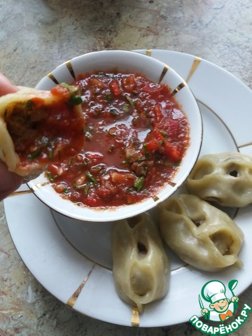 Подаём к столу горячие манты на большой тарелке с соусом в центре. Кушаем руками)) Приятного аппетита!