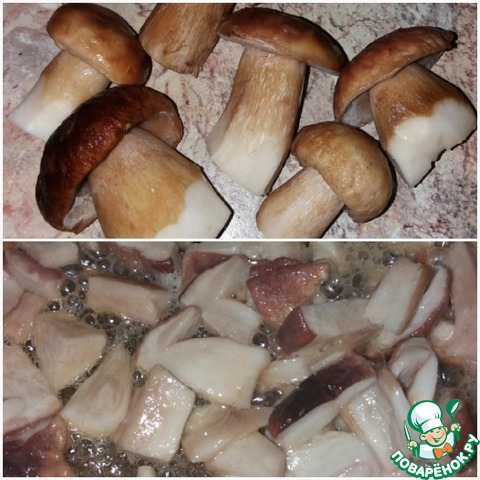 Освободим сковороду, переложив овощи в глубокую ёмкость и вынув лавровый лист. Теперь на 3 ст. л. масла обжарим грибы, предварительно нарезав их небольшими ломтиками, минут 10 на сильном огне, постоянно помешивая.