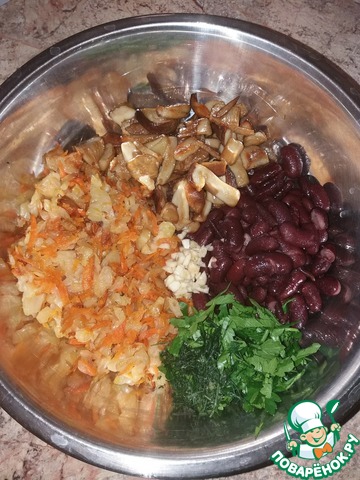 Переложим грибы к капусте, добавим фасоль (слив жидкость), мелко порезанный чеснок и зелень.