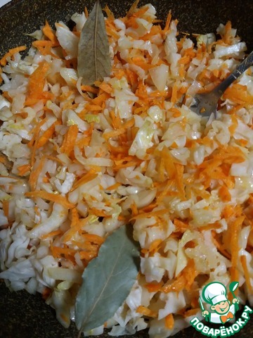 Приступаем к приготовлению многокомпонентной начинки. Для этого очищенные овощи измельчим: капусту мелко нашинкуем, лук тоже порежем на маленькие кусочки, морковь натрём на крупной тёрке. Теперь отправим их в разогретое на сковороде масло (5 ст. л.), добавим лавровый лист и соль, потушим минут 25.