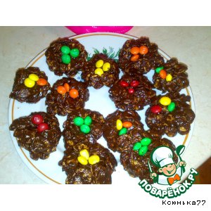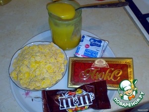 Нам потребуются: курузные хлопья, темный шоколад, мёд, сливочное масло, конфетки M&M`s.