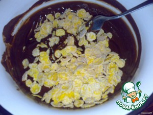 В получившуюся массу всыпать кукурузные хлопья и аккуратно перемешать.