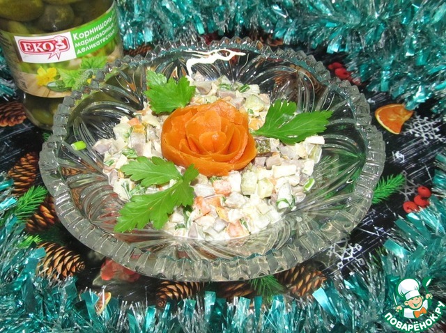 Салат не зря получил такое название, ведь он состоит из наших традиционных продуктов (кроме майонеза). Очень приятное сочетание мясных и соленых продуктов, а кориандр добавляет пикантности. Очень хорош в качестве закуски.