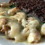 Креветки на подушке из авокадо и лука-порея запеченных под сырм пармезан. Довольно нежное и вкусное блюдо.