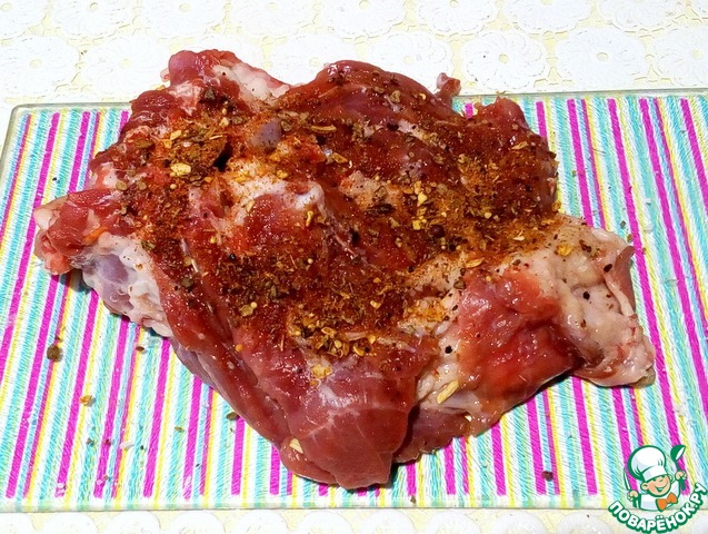 Баранью шею разрезать на куски. Растолочь в ступке оба вида перца с солью, добавить к ним приправу для баранины, перемешать. Натереть мясо со всех сторон. Если приправы для баранины нет, то хорошо сочетаются с бараниной -кориандр, тимьян, зира, розмарин, паприка, черный и острый перец, сушеный чеснок, мускатный орех, иногда добавляют имбирь, возьмите по щепотке, что найдется дома.