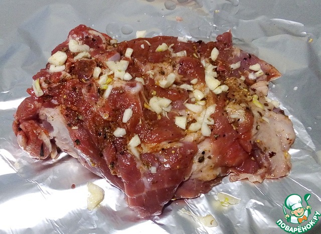 Отрываем кусок фольги, смазать ее маслом, чтобы мясо не прилипло, мелко рубим чеснок и раскладываем на мясо. Заворачиваем плотно в фольгу, каждый кусок отдельно. Укладываем в форму, сверху еще накрыть плотно фольгой и в духовку 165°C на 2 часа. Подготовка занимает очень мало времени, время уходит на запекание в основном.