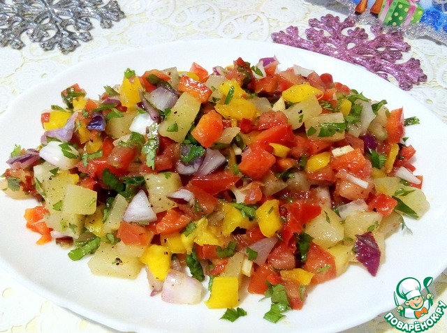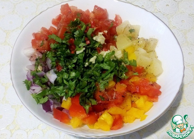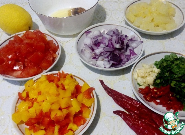 Нарезать вручную ананас, свежие помидоры без мякоти, мелко чеснок, зелень и острый перец. Перец острый можете взять по вкусу, но для баранины вся изюминка в остроте.