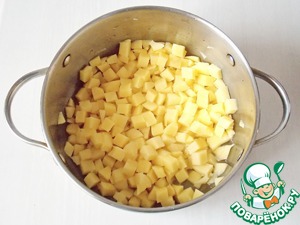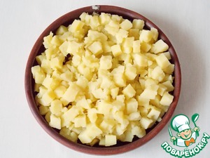 Чтобы долго не возиться с нарезанием картофеля, берем кухонный комбайн "GALAXY". Установим специальную насадку и через минуту наши кубики готовы.