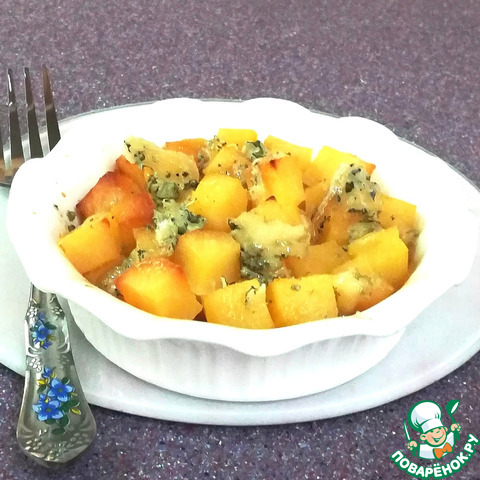 Посыпаем верх кусочками горгонзолой, но можно взять любой сыр с плесенью. Так как наша семья разделилась на два фронта в своей любви к этому сыру, поэтому одна сторона посыпана, а вторая нет. Чтобы не пачкать лишнюю посуду, но при этом все были довольны и сыты.
