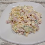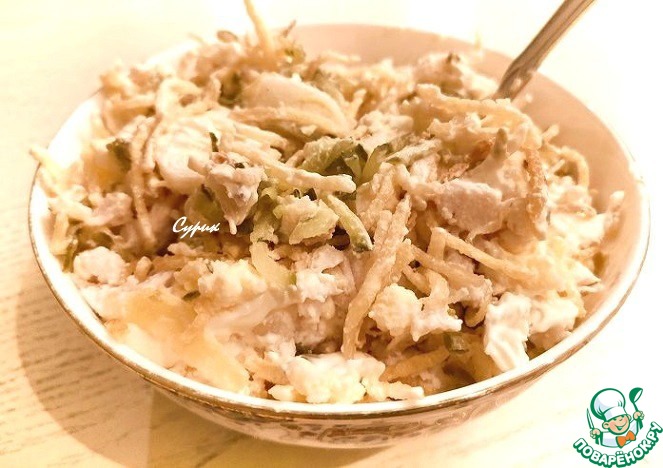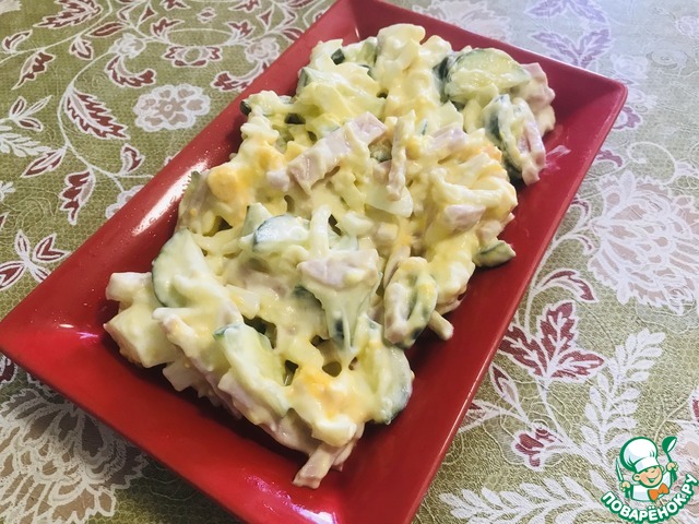 Режем ветчину, сыр, яйца и огурец соломкой.