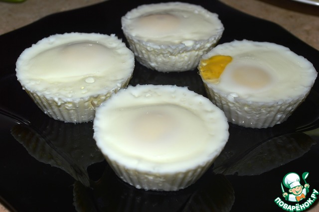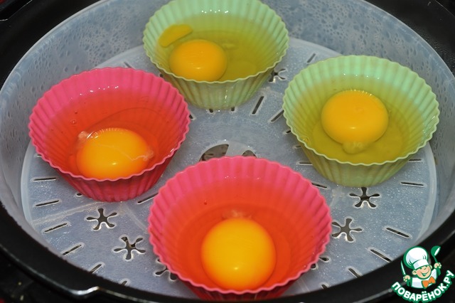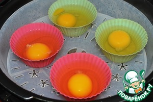 В силиконовые формочки разбиваем яйца. Как только вода закипит ставим их на решетку пароварки. Готовим 8-10 минут при закрытой крышке.