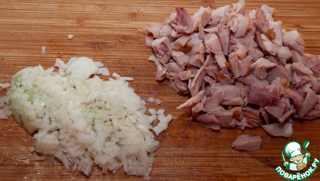Копченое куриное филе нужно нарезать небольшими кусочками. Лук мелким кубиком.