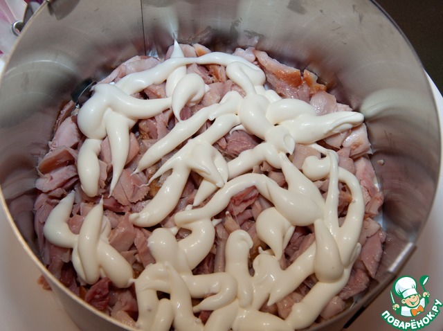 Первый слой — копченое куриное филе выложить на дно формы. Скрепить этот слой небольшим количеством майонеза.