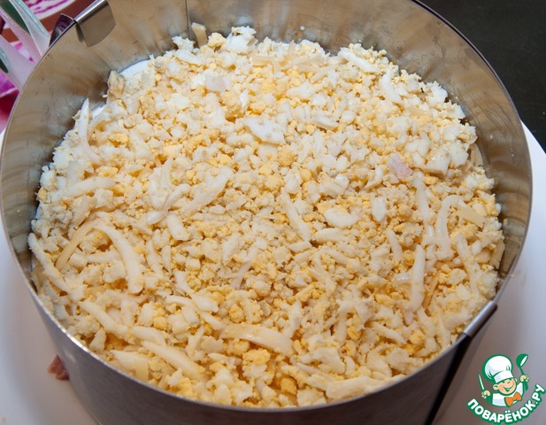 Далее выложить тертый сыр и яйца, покрыть майонезной сеточкой.