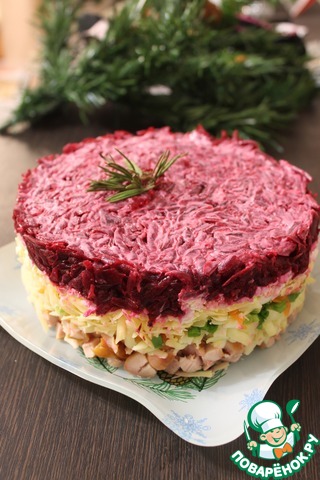Последний слой — свекла, смешанная со щепоткой соли и чесноком (пару зубчиков очистить и пропустить через пресс). Свеклу смазать сверху майонезом и убрать салат в холодильник на 2 часа или дольше, чтобы слои пропитались.