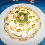 Удобно собирать торт в разъемной форме. Накрыть другим блином и таким образом собрать весь торт. Верхний блин ни чем не смазываем. Убираем торт в холодильник минут на 20-30. -
