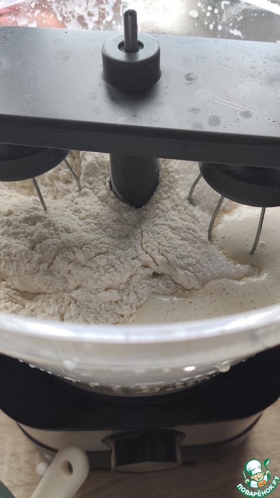 Поместить в чашу комбайна GALAXY GL2300, масло растительное, яйца, молоко с помощью насадки венчики взбить.