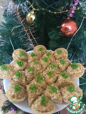 Разложила селедочную икру в тарталетки и украсила зелёным луком.