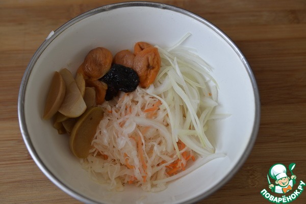 Берём квашеную капусту, кладём отжатый лук и сухофрукты.