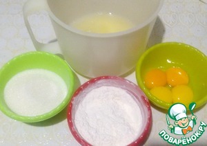 Расчет на одно куриное яйцо С1- мука-20г, крахмал-20г, сахар-50г, вода хол.-1 ст. л., ванильный сахар 0,5 ч. л., разрыхлитель- 0,5 ч. л.