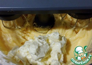 Взбить белки с водой до пены, затем добавить сахар и взбивать до пышной устойчивой массы, но не сухой. Скорость убавить, добавить желтки, промешать 15-20 секунд