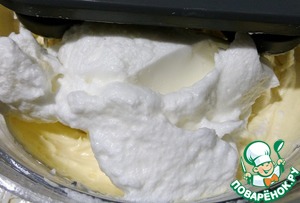 Отдельно взбиваем 8 белков из холодильника с оставшимся 150г сахара в стойкую пену и вводим в три приема в крем, перемешиваем.