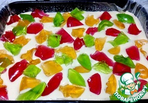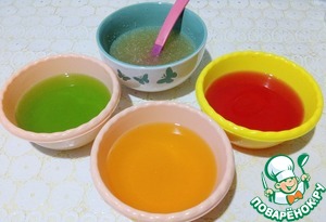 Первым делом нужно развести желатин в 150 мл воды, холодной или горячей -читать на упаковке. Отставить набухать до нужного момента. Желе разноцветное развести водой, как указано в инструкции, но взять на 50мл меньше. Поставить в холодильник для застывания.