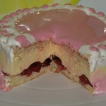 Например на форму 20-24см (круглую, квадратную) делаем, как из одного яйца один корж, так и из двух -соответственно увеличиваем остальные ингредиенты. И еще, суфле я оставляю то же количество. Только выливаю на корж в два -три приема и укладываю между кусочки желе. Можно просто одно суфле приготовить в красивой фигурной форме. Хотите пониже торт, разделите ингредиенты для суфле пополам. Берем любую кастрюлю, в которую поместиться корж. Так же, застилаем ее пленкой и выкладываем корж, суфле с желе, корж. Потом просто перевернуть на блюдо после застывания, убрать пленку.