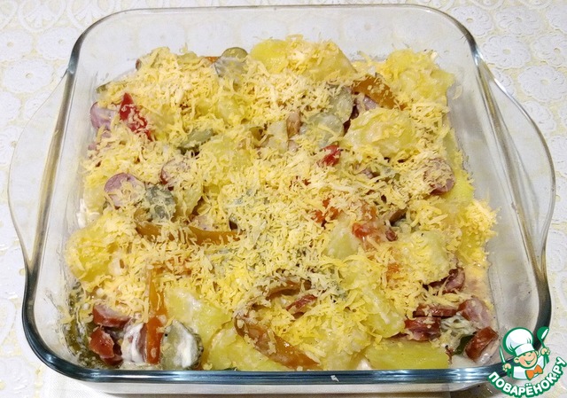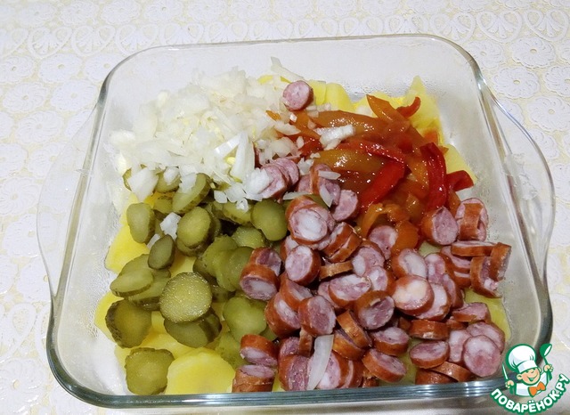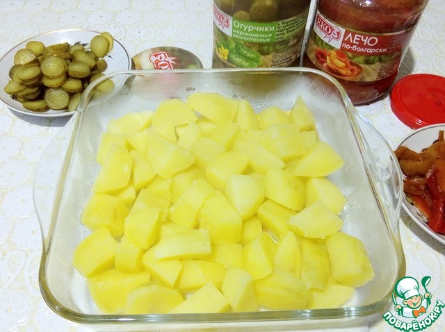 Картофель очистить, нарезать крупными кубиками, залить кипятком, поставить на огонь и дать закипеть, посолить, варим 10 минут после закипания и сливаем на дуршлаг. Форму смазать сливочным маслом, выложить картофель. Очень вкусные огурчики маринованные деликатесные ТМ ЕКО нарезать тонкими колечками. Открыть баночку лечо-по болгарски ТМ ЕКО.
