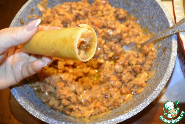 Начинку остудить до комнатной температуры. Начинить каннеллони (предварительно не отваривать!) мясной начинкой. Плотно, но не утрамбовывать.