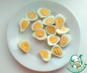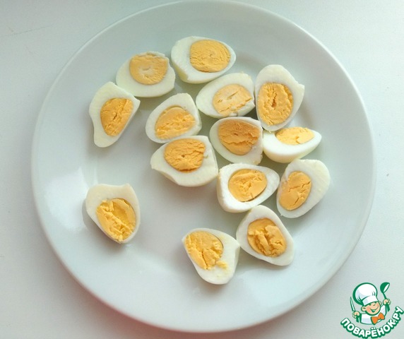 Отварить перепелиные яйца, почистить и разрезать на половинки.
