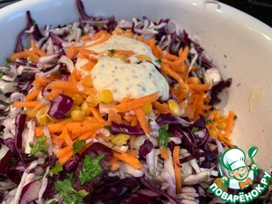 Выложите в большую миску зелень, капусту, морковь, кукурузу, заправьте салат и хорошо перемешайте.