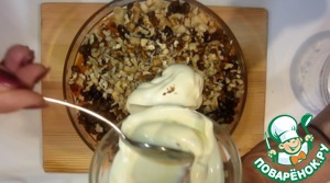 Все объединяем в салатнице, морковь, яблоко, грецкие орехи, чеснок и заранее промытый изюм. Заправляем салат майонезом.