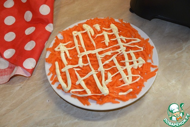 Выложить натертую морковь нижним слоем на плоское блюдо. Наложить майонезную сетку.