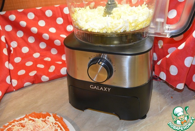 Яйца отварить, очистить и натереть на крупной терке. В этом мне так же помог мой кухонный комбайн GALAXY GL2300.