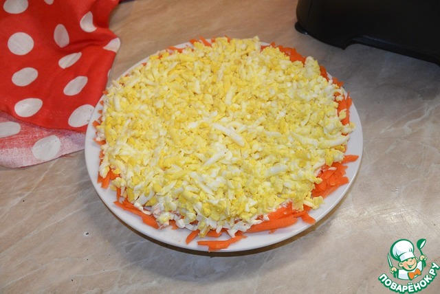 Выложить тертые яйца вторым слоем.