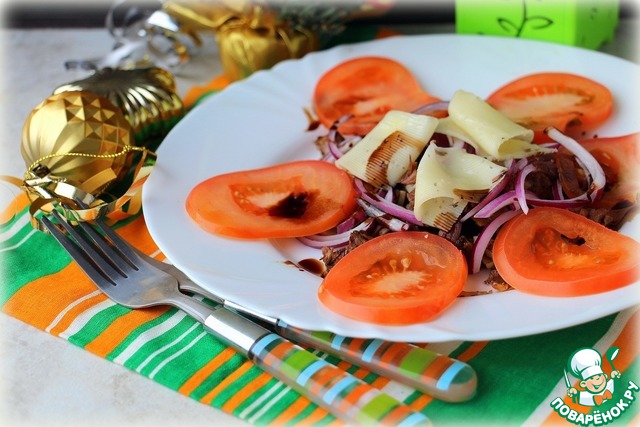 На тарелку выложить теплое мясо, посыпать полукольцами лука, выложить слайсы помидор и сыра, полить оливковым маслом и бальзамическим соусом.
