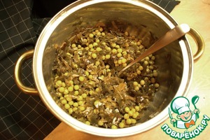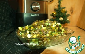 Количество не указано, т. к. кроме лука и укропа все составляющие должны быть строго одинакового объема! Иначе такого вкусного салата, как нужно не получится, какой нибудь ингредиент затмит другой и будет совершенно иной вкус. Соединить горошек (жидкость слить) с морской капустой (вместе с рассолом).