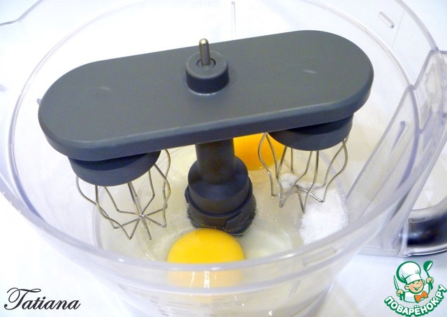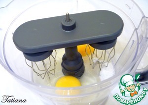 В чашу кухонного комбайна поместите яйца+соль+сахар, смешайте при помощи насадки венчики.