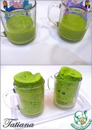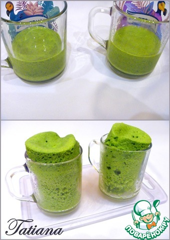 Выпекать зеленый хлеб желательно в микроволновке (чтобы не запеклась румяная корочка). Выложите тесто в термостойкие кружки (ничем смазывать не надо, тесто наполняйте на 1/3 кружки). Готовьте в микроволновке при