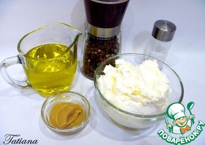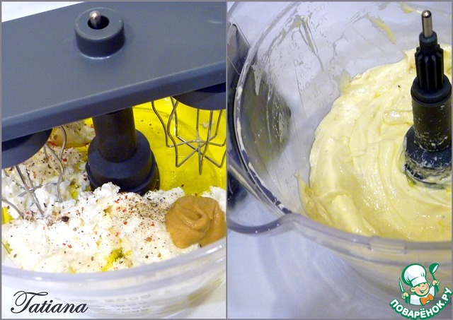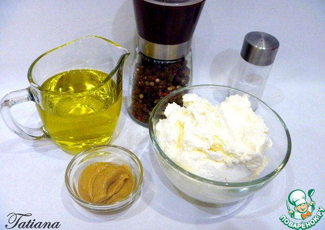 В чашу кухонного комбайна положите творожно-сливочный сыр, добавьте оливковое масло+соль+перец+гор чицу. Смешайте соус при помощи насадки венчики на 2-ой скорости 1,5-2 минуты. Получится густой соус (внешне похожий на майонез). Соус переложите в баночку, уберите в холодильник.