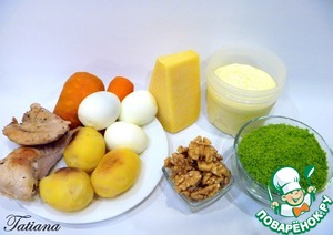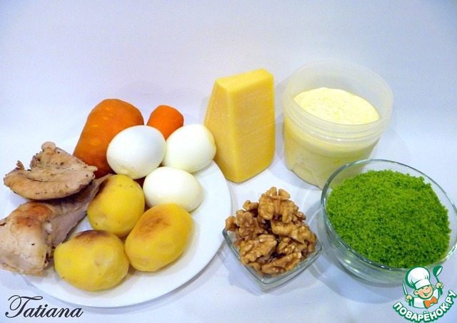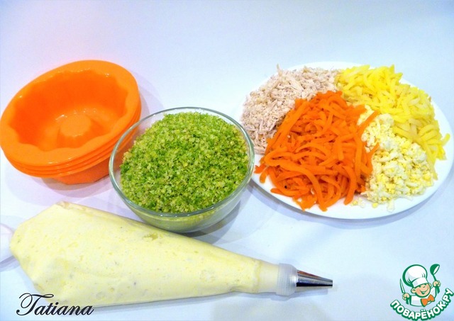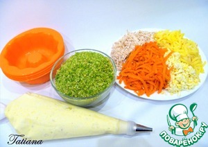 Слои салата :картофель - соус - морковь - соус - курица - соус - хлебно-сырная крошка - соус - яйцо - соус и т. д. -