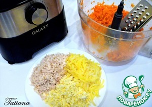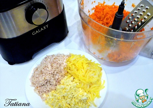 В чашу кухонного комбайна установите насадку для шинковки, измельчите по очереди запеченную охлажденную куриную грудку, затем яйца, потом картофель и морковь.
