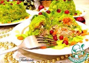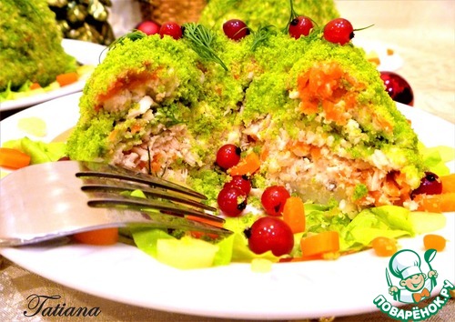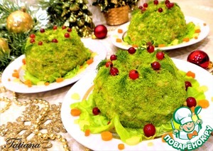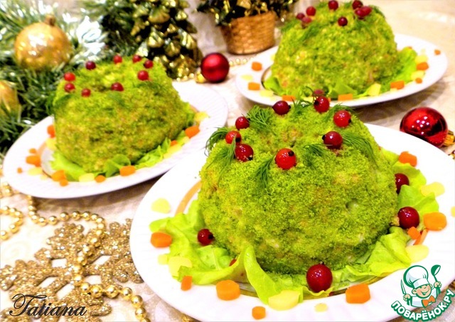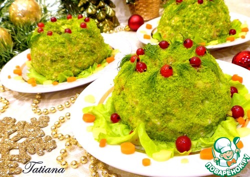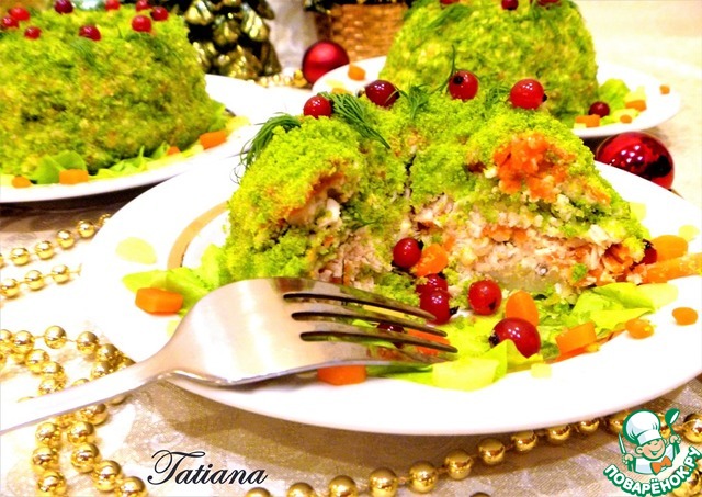 Новогодний салат с куриным филе, запеченными овощами под ярко-зеленой хлебной крошкой с сыром и орехами. Особую пикантность салату придаст заправка из творожно-сливочного сыра с горчицей и оливковым маслом. Приготовить салат можно как на большом блюде, так и порционно. Красочный слоеный салат в любом случае украсит праздничный стол.